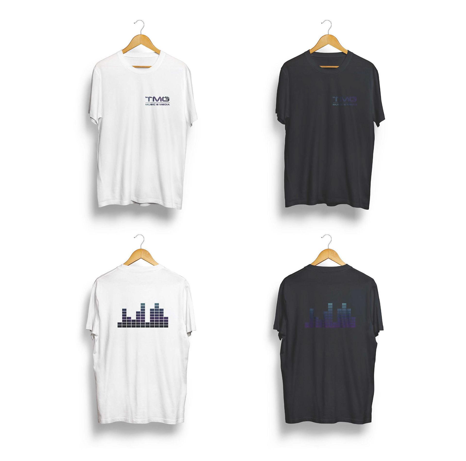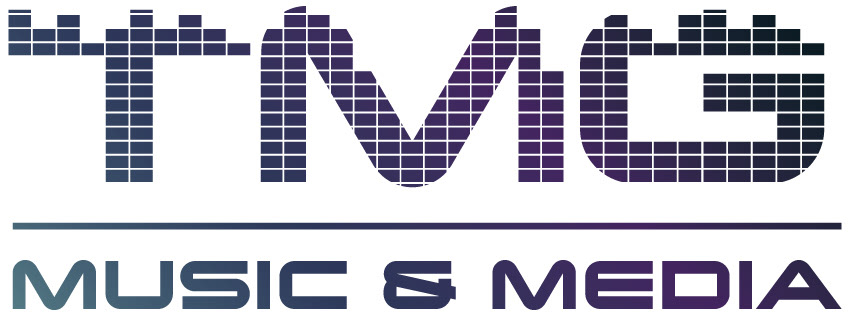 Logo for music producer TMG Music and media using equaliser bars from the logo as a free-standing graphic across the brand.